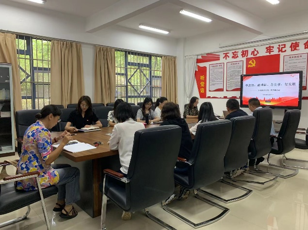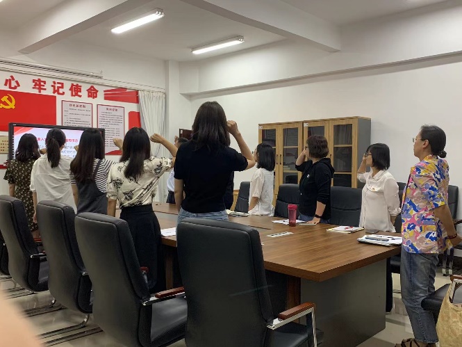 首先,外语部党支部书记黄兴亚同志带领全体党员重温了入党誓词。全体党员面向鲜红的中国共产党党旗,举起右拳,用铿锵有力的誓言,表达着党员们入党的初心,为共产主义事业奋斗终身的信仰以及对党和人民的忠诚。随后,由马行天同志领学《在学习贯彻习近平新时代中国特色社会主义思想主题教育工作会议上的讲话》,进一步深化对此次主题教育活动的认识。