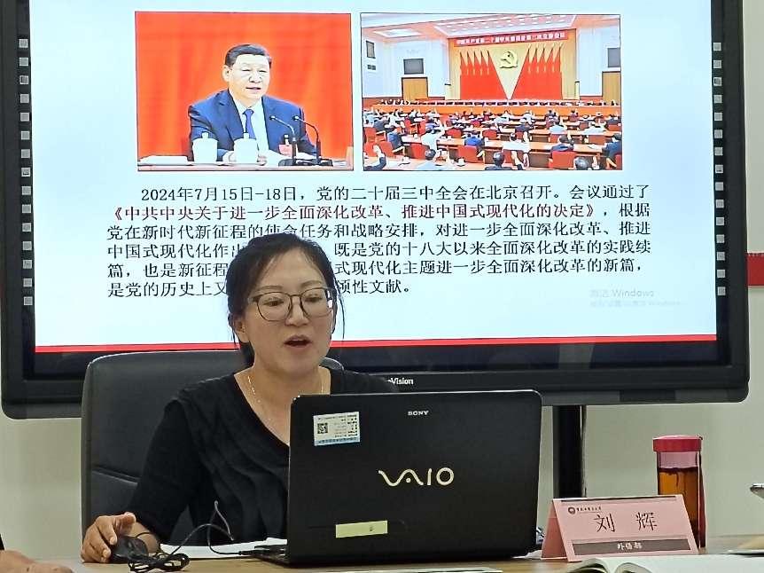 此次讲座的主题是《紧扣中国式现代化主题,进一步全面深化改革》。首先,刘辉老师以改革开放的历史为引,分析了二十届三中全会在中国改革开放和中国式现代化进程中的历史方位,分析了此次大会在我党历史中的重大意义。其次,刘辉老师讲解了全会通过的《中共中央关于进一步全面深化改革、推进中国式现代化的决定》,介绍了进一步全面深化改革的1个总目标,6个重大原则,7个聚焦等内容。接着,她结合高校工作实际展开讲解了《决定》中提到的“完善学生实习实践制度”和“优化区域教育资源配置”等与高校息息相关的内容,并鼓励与会教师通过《二十届三中全会< 决定>学习辅导百问》等教材进一步学习全会精神,将全会精神融入到日常工作和课程思政当中。