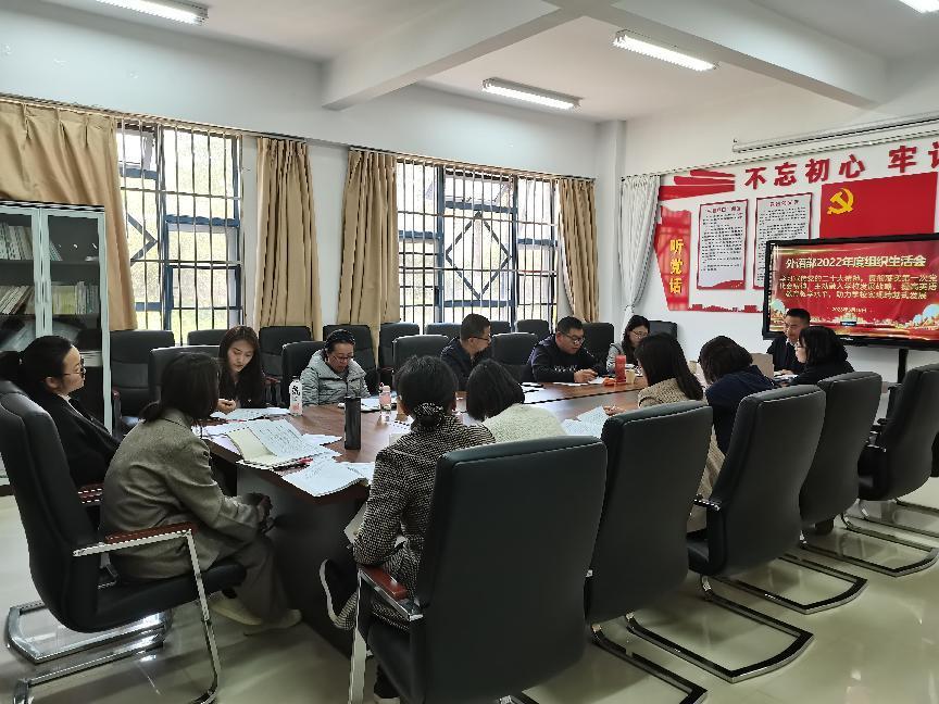 外语部党支部对此次组织生活会高度重视,在开会前期做了充分的准备,党支部组织党员以个人自学、集体领会相结合的方式,紧扣组织生活会主题和有关要求认真组织专题学习研讨,深入开展谈心谈话、广泛开展意见征求,为开好组织生活会打牢思想基础。本次组织生活会的主题是:学习宣传二十大精神,贯彻落实学校第一次党代会精神,主动融入学校发展战略,提高大学英语过级率和考研升学率,助力学校实现跨越式发展。