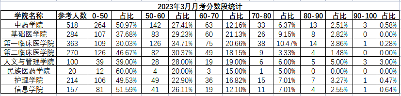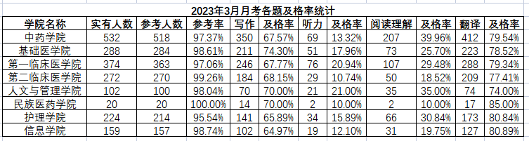 本次大学英语四级月考,应考人数1971人,实考人数1926人,参考率为97.1%,及格人数527人,及格率为27.36%,其中60-70分有324人,70-80分有139人,80-90分有55分,90-100分有9人。