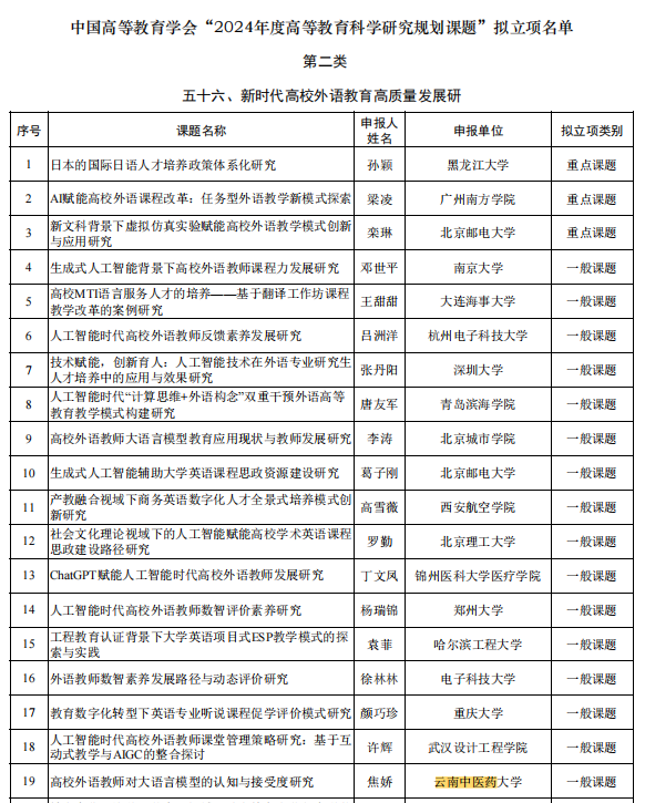 近日,中国高等教育学会公布的中国高等教育学会“2024年度高等教育科学研究规划课题”拟立项名单,外语部焦娇老师申报的“高校外语教师对大语言模型的认知与接受度研究“获得立项,这是我部门首次获得中国高等教学会项目立项。该项目主要针对人工智能领域新兴技术冲击并挑战外语教育的现实处境,以高校外语教师为研究对象,探讨并评估教师对ChatGPT等大语言模型的认知与接受程度,尝试创新高校外语教师发展模式、推动教师队伍建设。外语部将按照学校高质量发展三年行动计划的要求,在做好外语教学工作的同时深入思考科研创新,以科研提升教学质量,以教学推动科研发展。