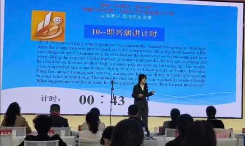 云南省赛区决赛分两轮进行,首轮为定题演讲和即兴问答,第二轮为即兴演讲环节。全省81名选手围绕“Strike the Waves”主题进行角逐,我校基础医学院陈宥丞、第一临床医学院周许琳和彭婧仪3名同学,凭借扎实的语言功底、流畅的表达能力、深厚的思辨水平及沉着冷静的台风,在第一轮激烈的竞争中脱颖而出,顺利晋级第二轮。第二轮共有36名晋级选手参与角逐,主要考察选手即时反应、语言组织及逻辑构建能力。